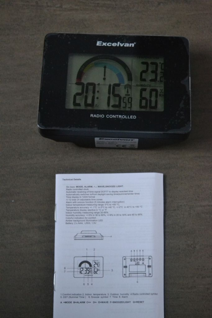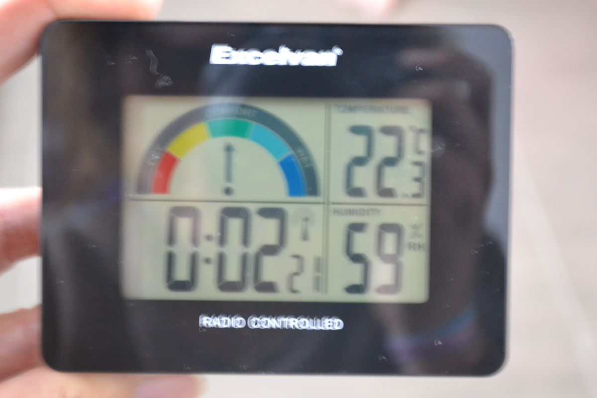 Il indique l'heure, la température de la pièce, le pourcentage d'humidité et un hygromètre, et la fonction réveil.